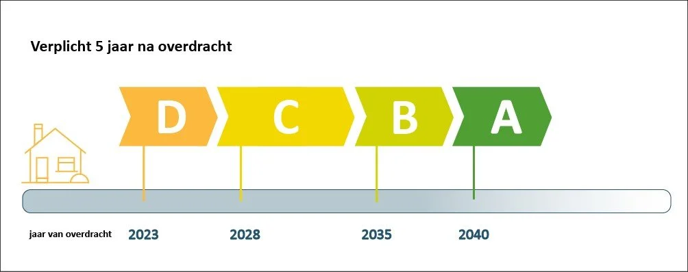 Alle woningen en appartementen die vanaf 2023 zijn aangekocht met EPC-label E of F, moeten verplicht gerenoveerd worden naar label D of beter, binnen de 5 jaar na aankoop. Dit minimaal EPC-label na overdracht wordt vanaf 2028 aangescherpt tot label C, vanaf 2035 tot label B en vanaf 2040 tot label A.